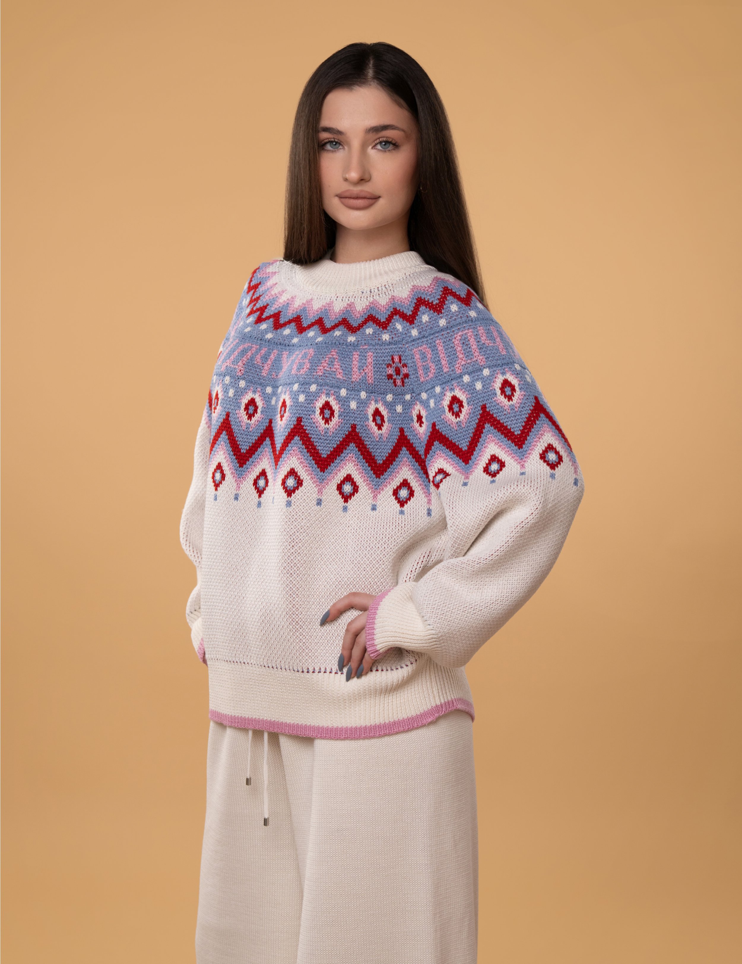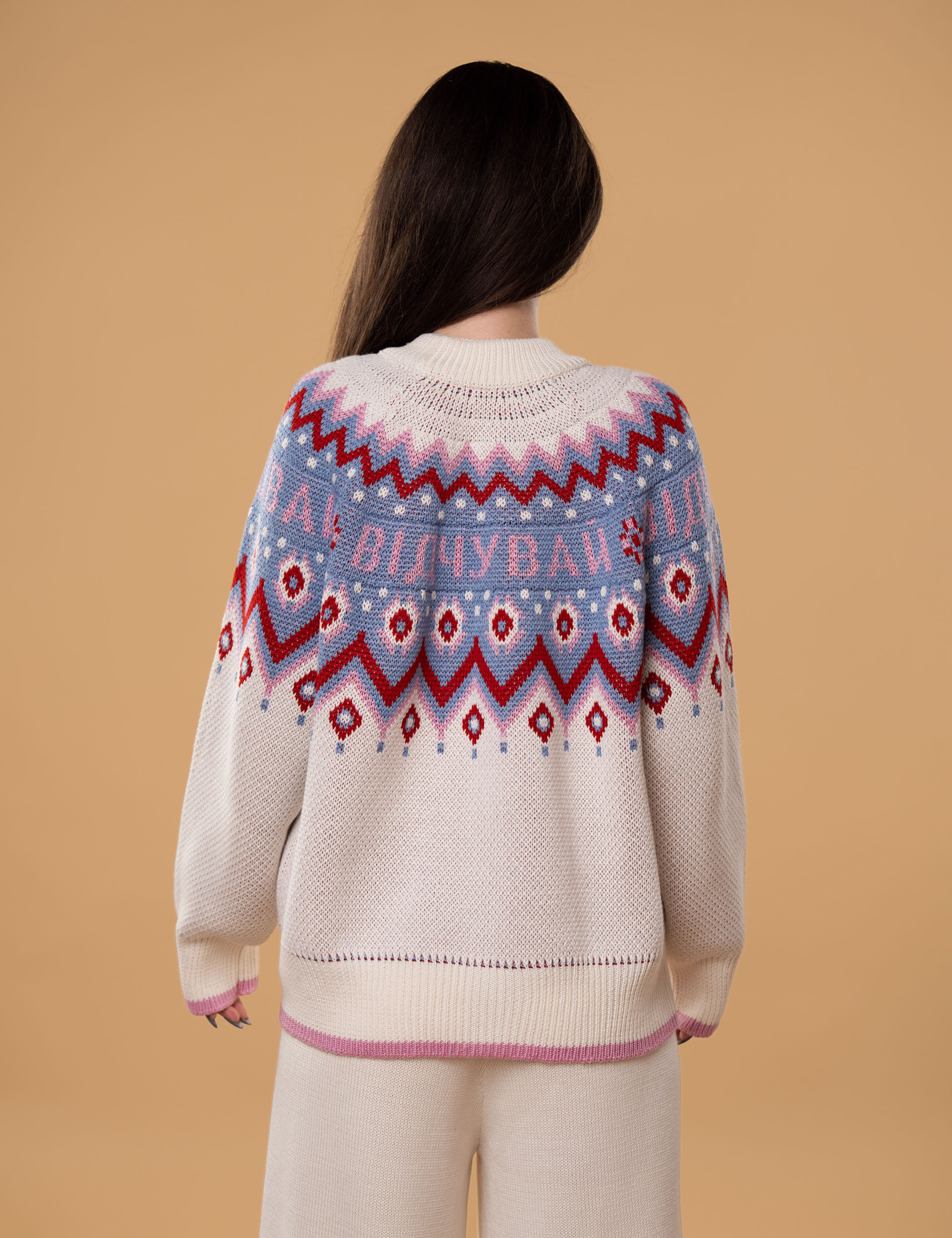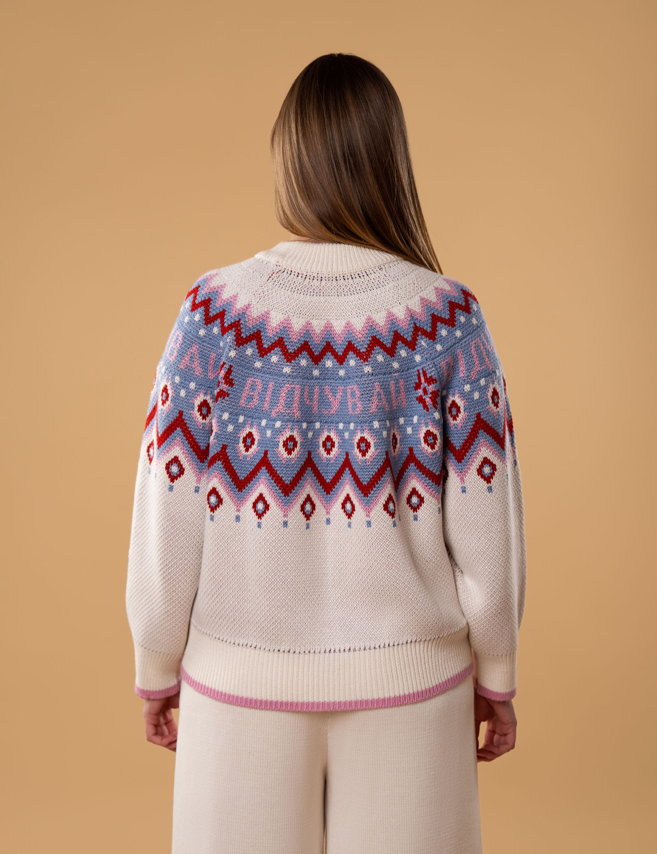 • Светр виготовлений за допомогою подвійного жакардового переплетення з кольоровим малюнком та написом "Відчувай";