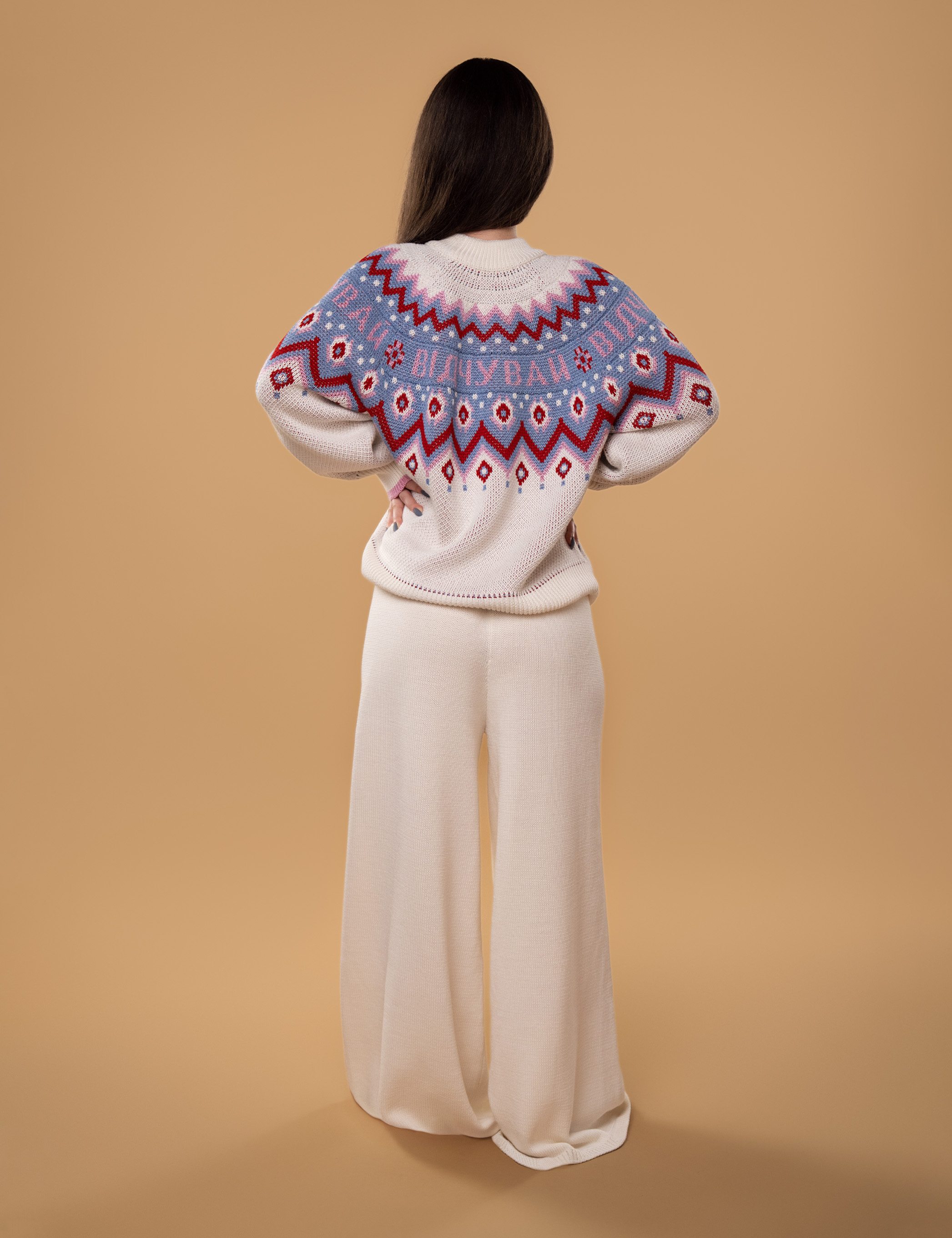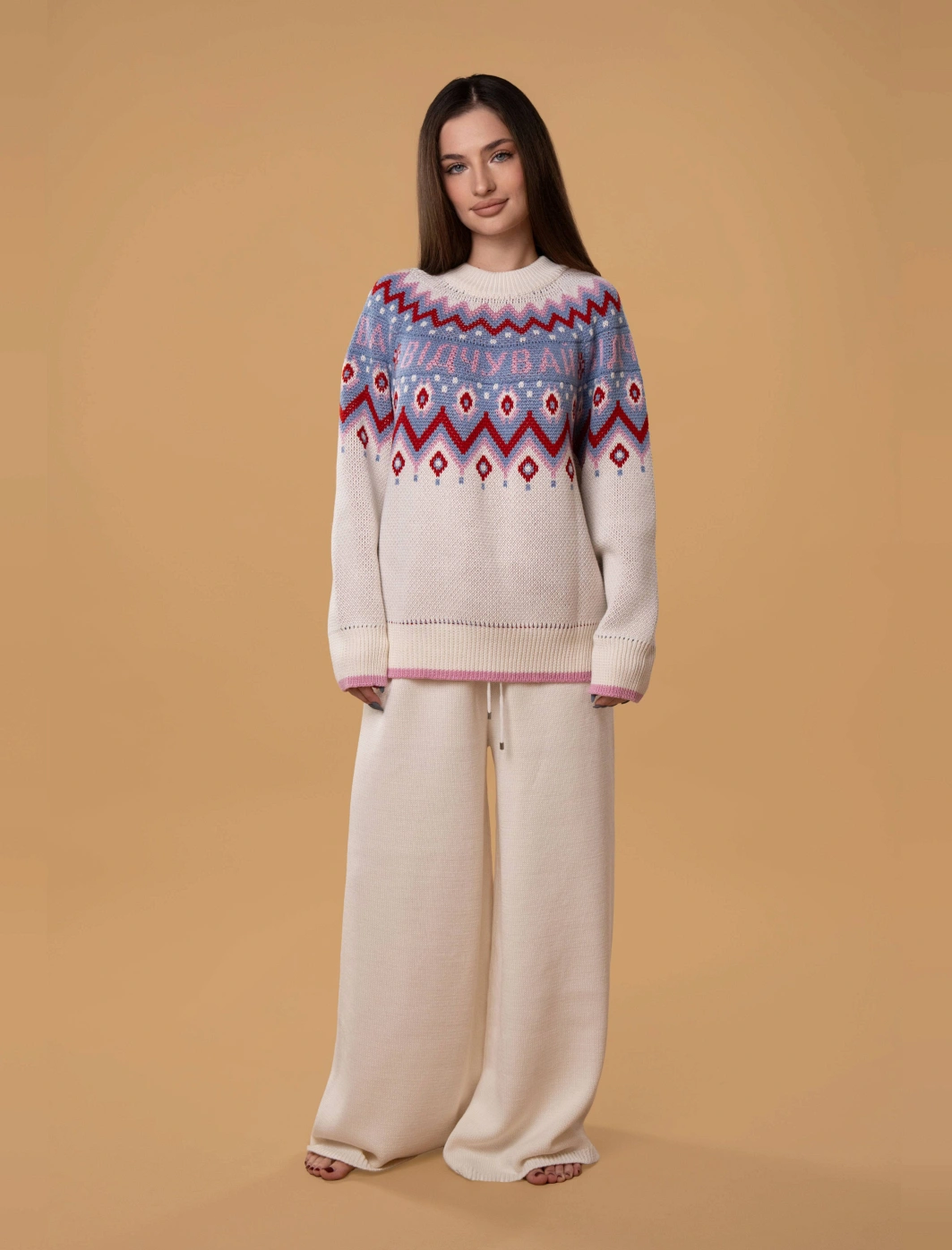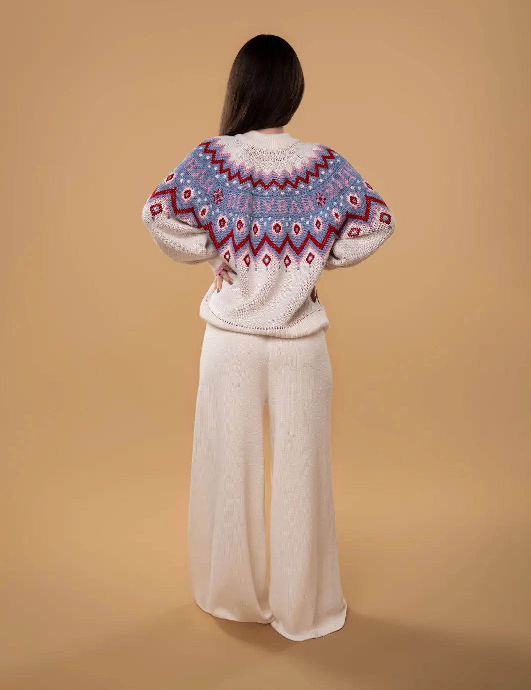 • Светр виготовлений за допомогою подвійного жакардового переплетення з кольоровим малюнком та написом "Відчувай";