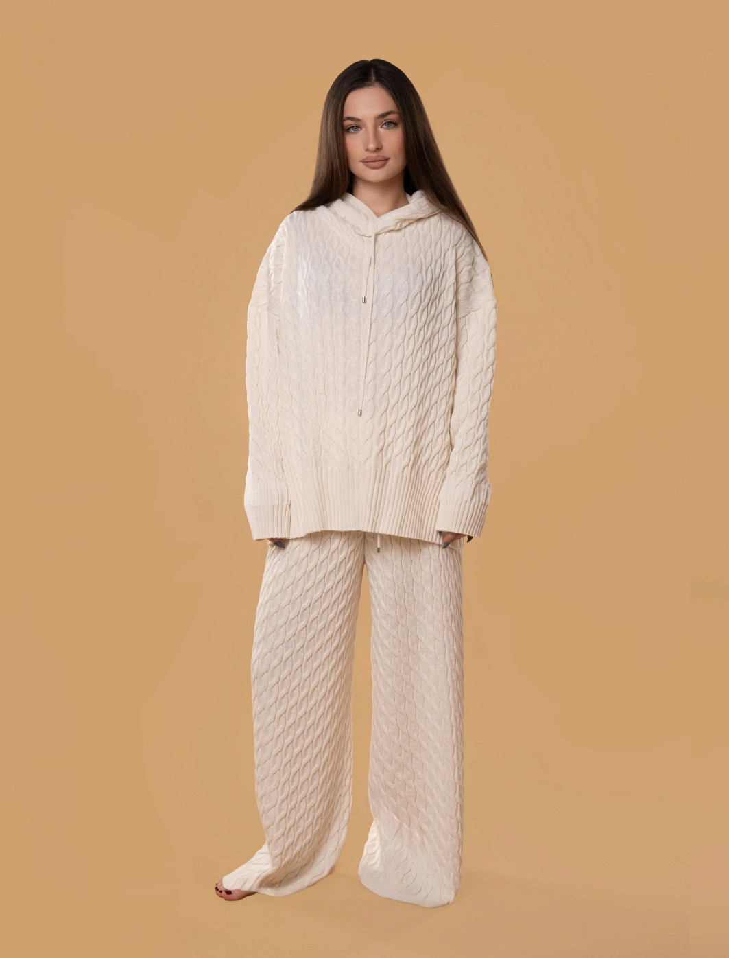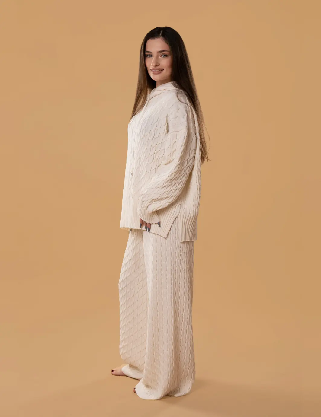 • Горловина светра, низ виробу та рукави виконані з ріб-манжету з вільним краєм.